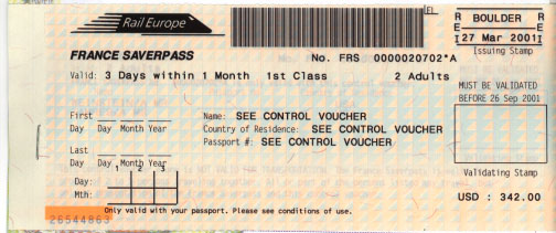 For example: A and I have a SaverPass that is valid from 3/27/01 to 9/27/01 that will allow us to travel on three one-way train trips within a thirty days of the date we get the SaverPass stamped by a Rail France bureaucrat.